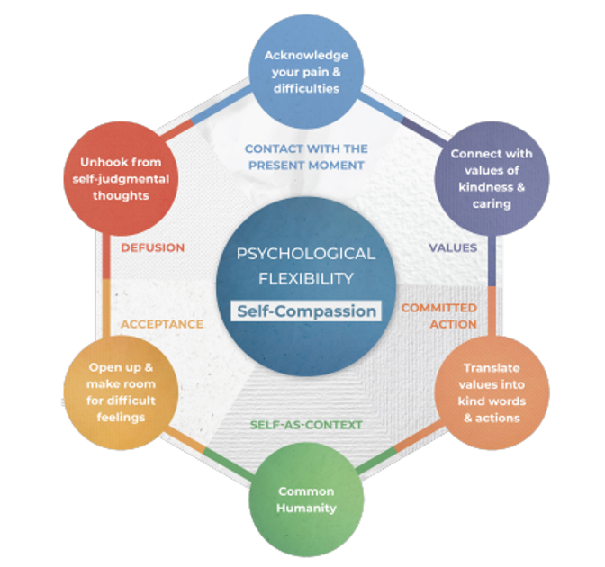 Техника гексафлекса в аст-терапии направлена на помощь клиенту в развитии психологической гибкости и жизни в согласии с собой и своими ценностями. В подходе ACT (Принятие и Снятие Контроля над своей Головой) используется техника «гексафлекса», который представляет собой шестиугольник, углы которого представляют навыки психологической гибкости. В ходе концептуализации специалист строит гексафлекс, определяя, какие навыки есть у человека, а каких нет, и с клиентом работает над развитием недостающих навыков.